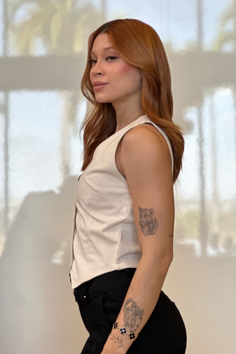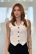Colete feminino em linho com design moderno e corte impecável. O destaque fica por conta dos botões e do formato, que trazem sofisticação e estilo único à peça.